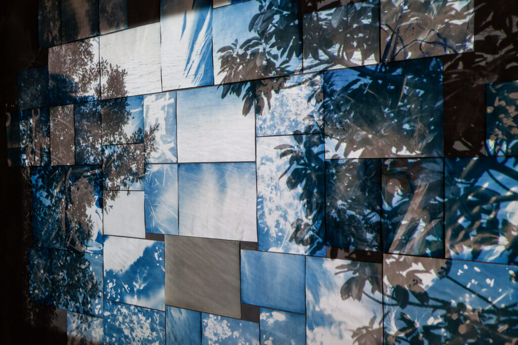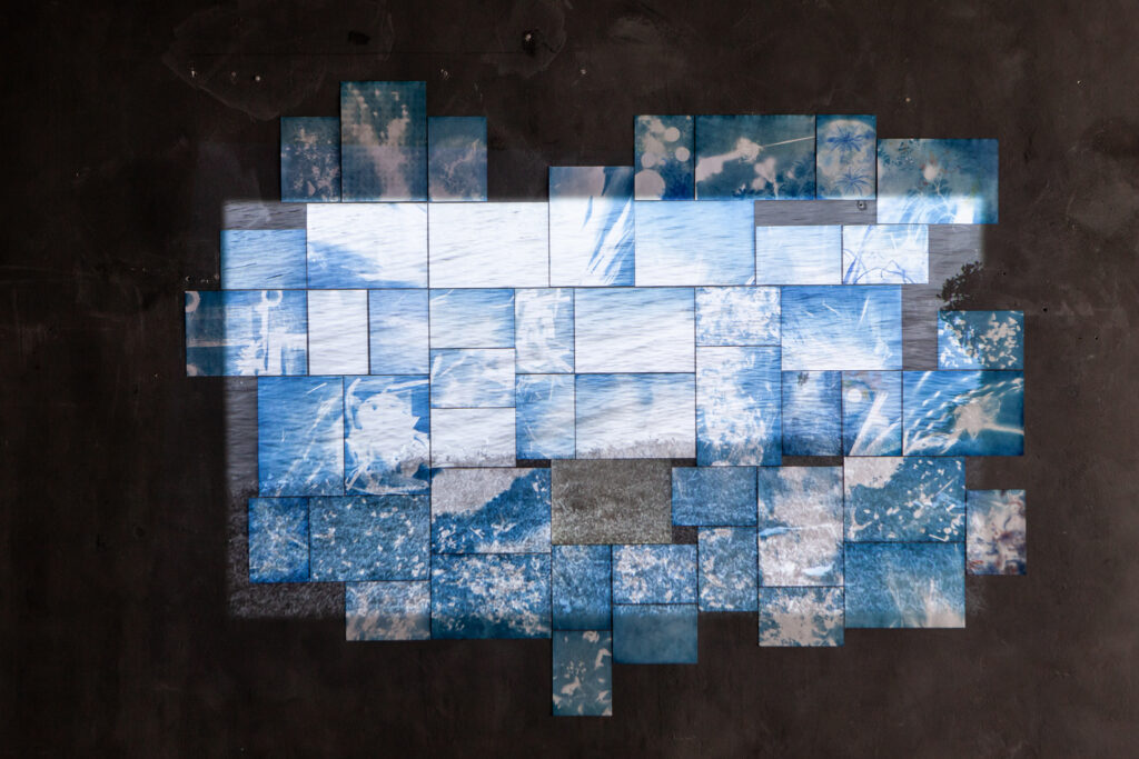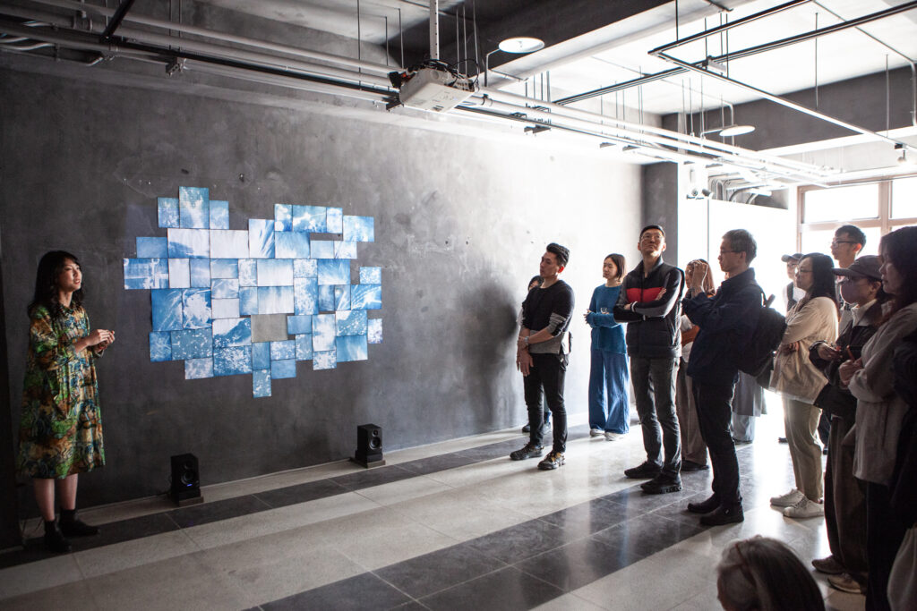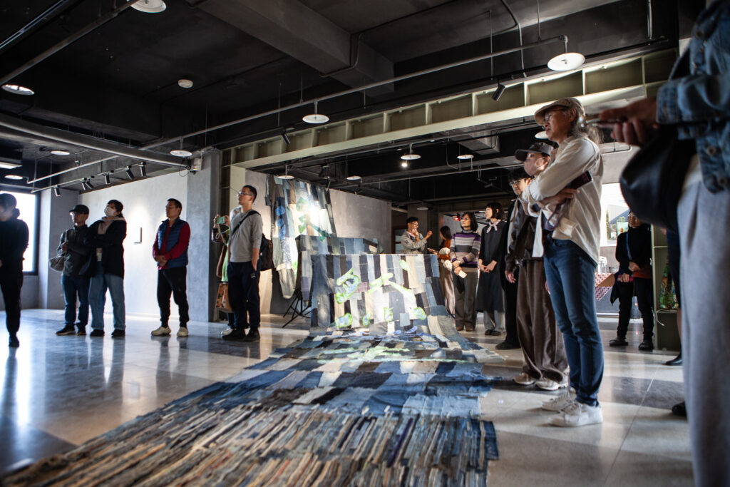 吳季禎使用「REHOW如禾永續」所提供的回收牛仔褲重新裁剪縫製建構出一條14公尺長的「河流」,作品既是回收物轉化的行動實踐也是對消費文化的挑戰,以手工縫製緩慢建構非自然物的再生可能性,透過布料、油墨與時間的疊加提出對材料生命延續性與創作倫理的反思;張皓媛以河岸採集物質製成的藍曬結合錄像,呈現工作室旁淡水河的多重切面,在看似平和的風景中,滲入對當代現實的隱微感受。以影像捕捉平靜河面下不時溢出表面的暗湧,探討人在城市與自然共生的交界帶,如何感知並回應潛伏於環境與時代中的不安與變動。