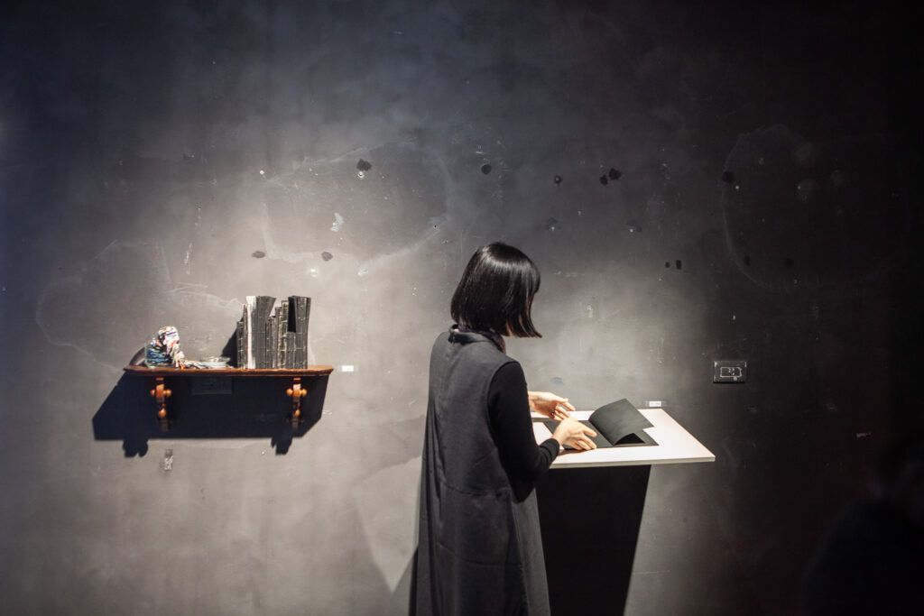 李映嫻以日常工作與筆記文件作為創作媒材,將書頁上覆以黑色水泥漆,一筆一筆像牆面粉刷,透過遮蔽與反覆地勞動,使「等待」、「未抵達」、「不可讀」等心理狀態,轉為可被觸摸與翻閱的經驗。